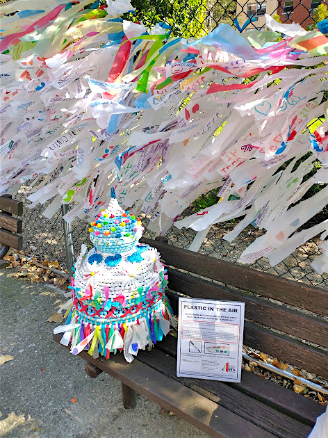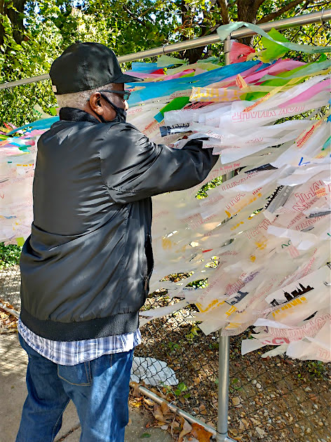 And so “Plastic in the Air” was a joyous and beautiful program and I enjoyed so much the camaraderie and positive vibes of the PSS Davidson Senior Center. In these troubling and difficult times, I could bear witness to the power of art, particularly free public art programs and how the community needs healing and action and visually enhanced environments to affirm our creative natures. There were two sections to the installation – a fence area and a tennis net area strung between two shady trees.