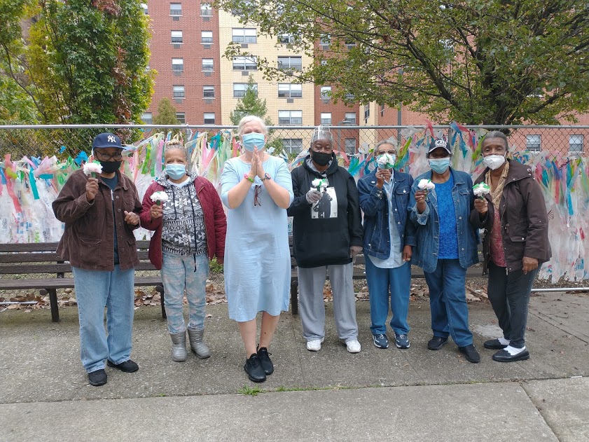 It was a great pleasure to build a new art installation this year, in our chaotic 2020. I received a community arts grants – Arts Fund – from Bronx Council on the Arts to partner with NYPL – New York Public Library. But as we know, New York City became the epicenter for the Covid-19 pandemic during March/April and all of the public libraries in the city swiftly closed down for health and safety reasons. So I was left with a grant but nowhere to build my program. Thanks to the amazing adult librarian Nina Maness she put me in touch with PSS – Presbyterian Senior Services, who to their credit recognized the advantages of swiftly approving our new partnership! So under the guidance of Michele Chapple, (director) & Nelly Sarante, (program coordinator), I began work on an outdoor installation with the help of their senior members.