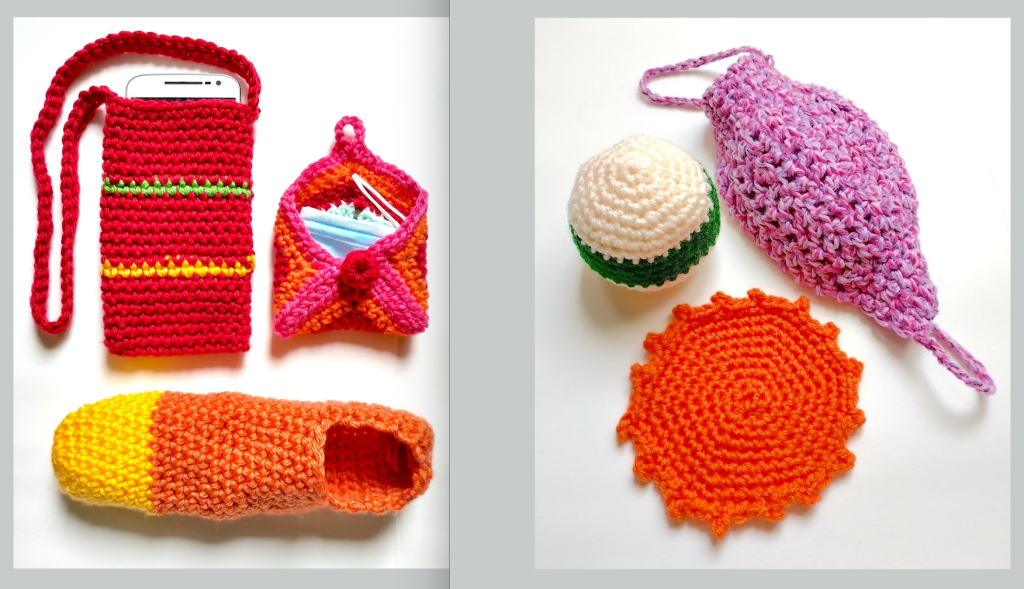 Pouches and bags to hold phones and masks. Along with cup of tea coasters, stress balls, cozy slippers, and a pretty decorative crochet mask to fit on top of your covid mask.