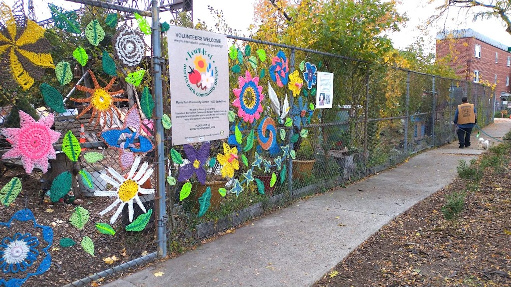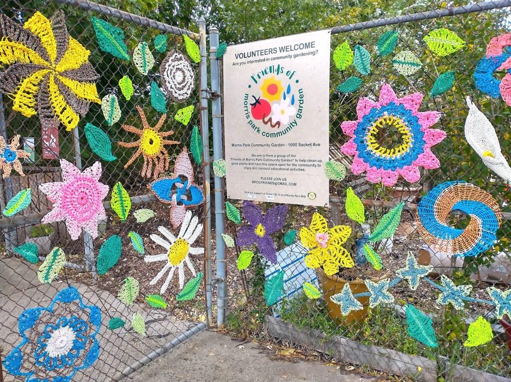 Long story short, one year later I have received an Arts Fund grant from Bronx Council on the Arts to further extend the Paracord decorations along the fencing of the garden. Paracord is the most wonderful thing. 550 Paracord is about 1/4 inch thick, super strong, comes in all sorts of bright colors, and is supple enough for crochet and crafting. Through my experience with working with Paracord Galaxy I was able to identify specific Paracord that is more colorfast. All skill levels are welcome to help us work on uplifting, revitalizing, and beautifying our Morris Park neighborhood community Garden this Spring, 2022! How much of this fence can we decorate? The more involvement by participants the more we can do!