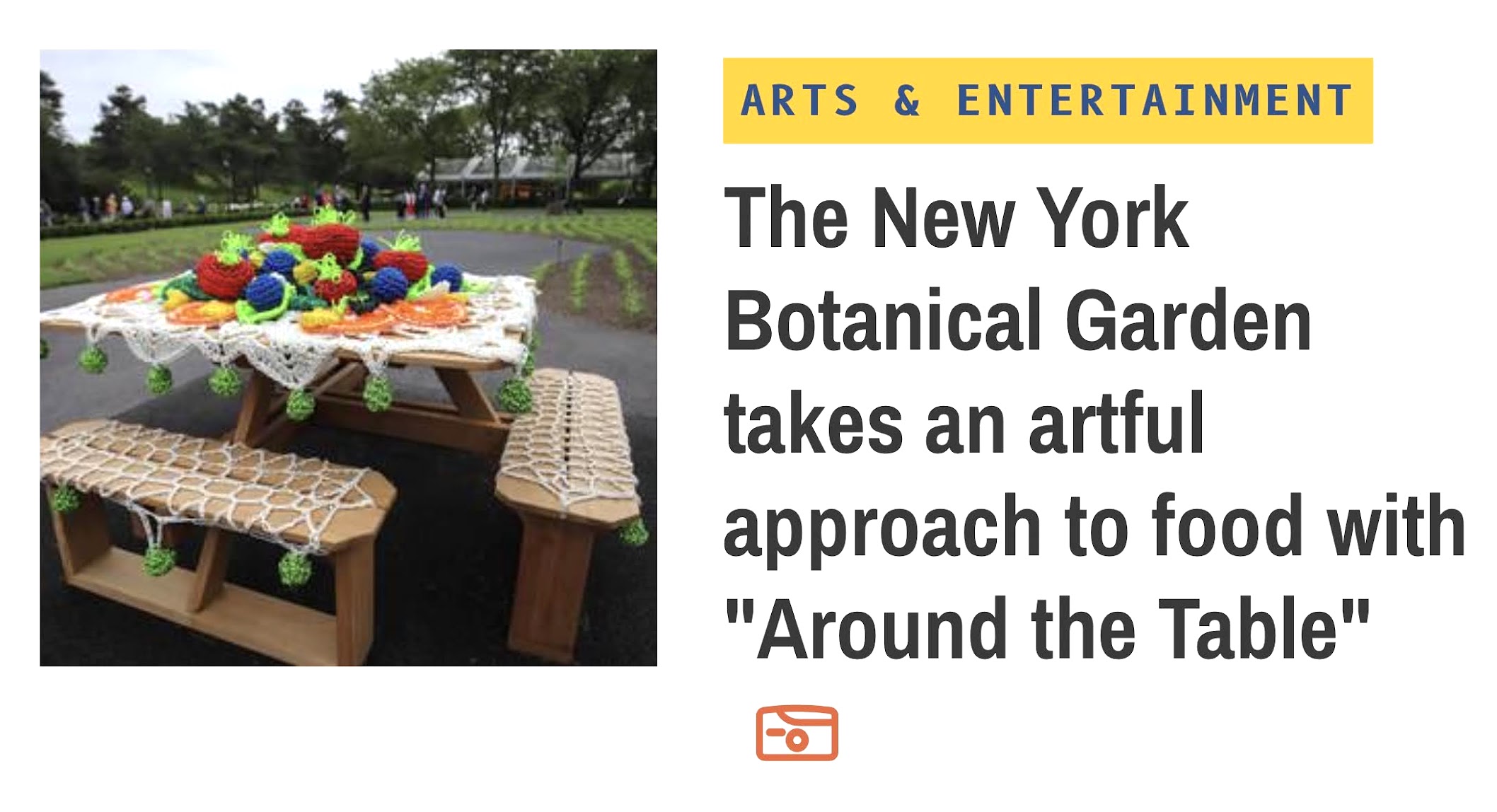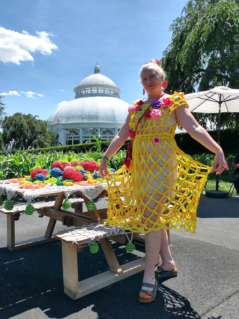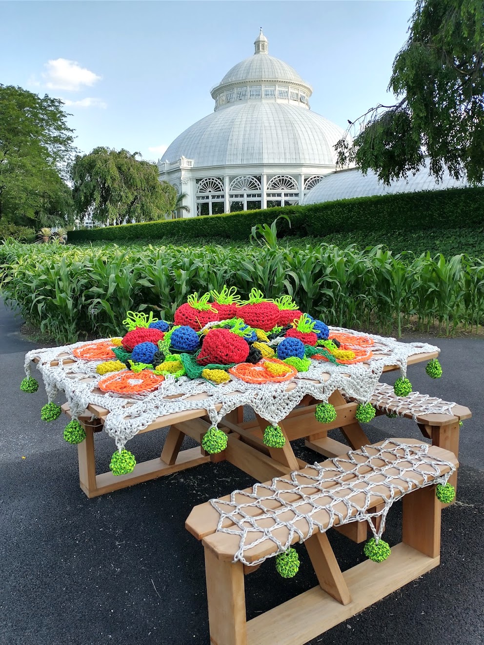 This exhibition is an institution-wide exploration of the cultural, environmental, and historical significance of food and edible plants. I am honored to be one of 30 Bronx artists included in the artistic interpretation segment of the exhibition with my crocheted paracord picnic table – “Tossed Salad”. My theme is based on my vegan diet and how much I enjoy combining fruits with my greens for a sweet and savory taste sensation. So strawberries, blueberries, oranges and corn are combined with kale, lettuce and spinach, all crocheted, all original designs, all tossed together on the table and attached with zipties, to create a 3-D invitation to sit and interact. I hope you can visit the conservatory and have fun with my table!