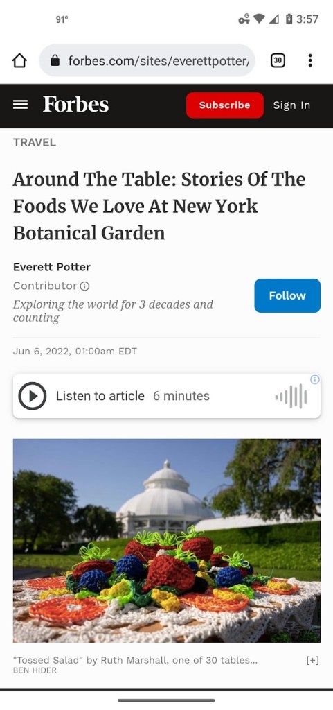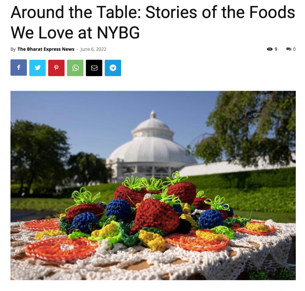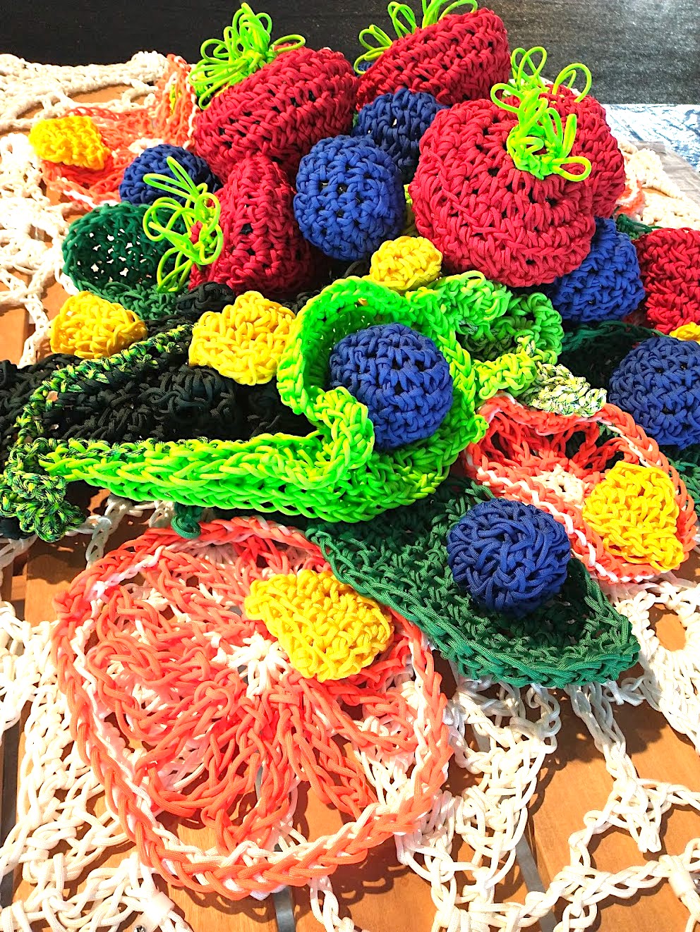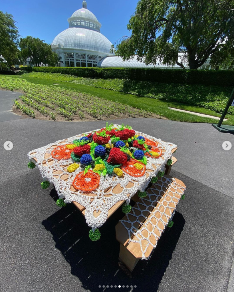 This exhibition is an institution-wide exploration of the cultural, environmental, and historical significance of food and edible plants. I am honored to be one of 30 Bronx artists included in the artistic interpretation segment of the exhibition with my crocheted paracord picnic table – “Tossed Salad”. My theme is based on my vegan diet and how much I enjoy combining fruits with my greens for a sweet and savory taste sensation. So strawberries, blueberries, oranges and corn are combined with kale, lettuce and spinach, all crocheted, all original designs, all tossed together on the table and attached with zipties, to create a 3-D invitation to sit and interact. I hope you can visit the conservatory and have fun with my table!