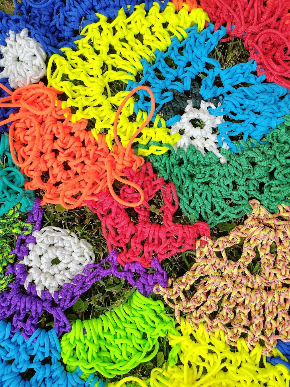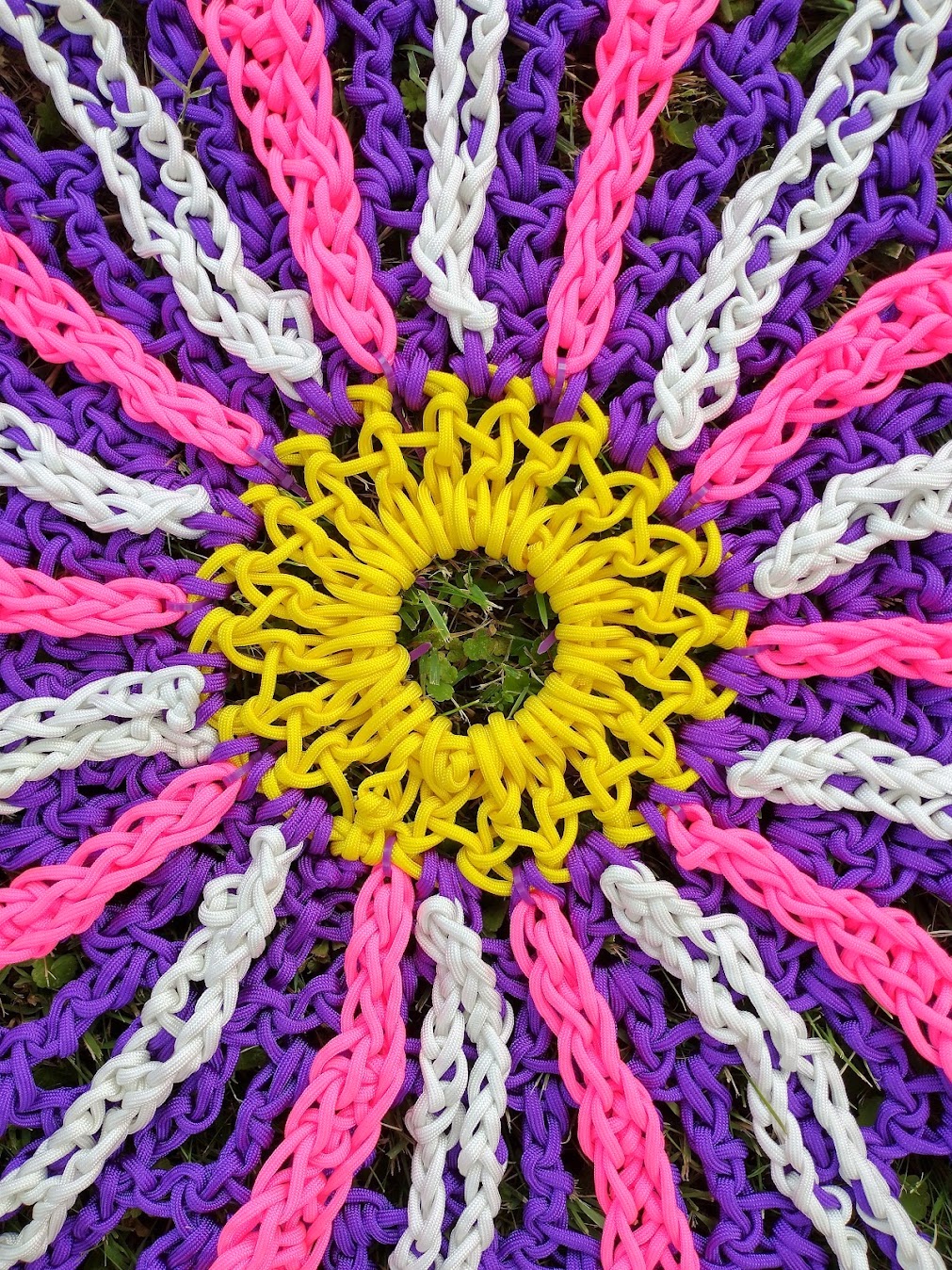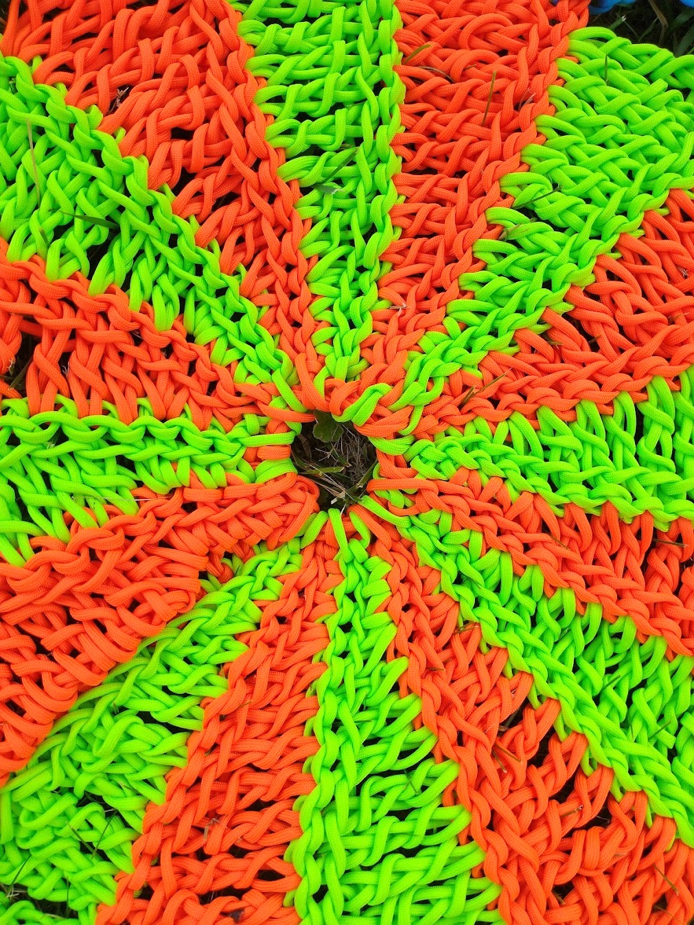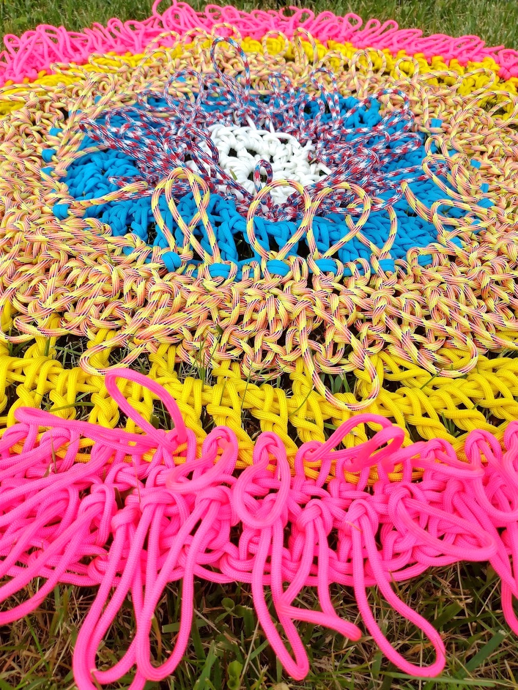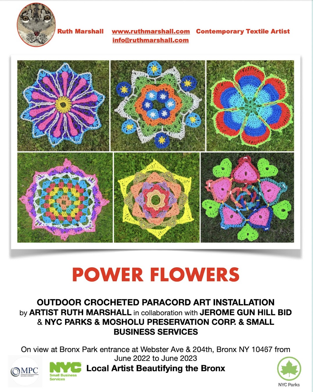 This year, (2022), I was so excited to create a new crocheted paracord installation in Bronx Park, at the Webster Ave & 204th St entrance in the Bronx. I was approached by the Jerome Gun Hill BID (Business Improvement District) as recommended by Jodi Moise, Director of the Fine Art Program at Montefiore Health System. I eagerly jumped onto this opportunity. Paracord comes in so many exciting colors and having worked closely before with the Paracord Galaxy company, (because there really is a galaxy of paracord colors!) I have a pretty good idea of which of their item numbers are more colorfast, as the sun is a brutal taskmaster in terms of fading manmade materials, especially in the red spectrum of colors.