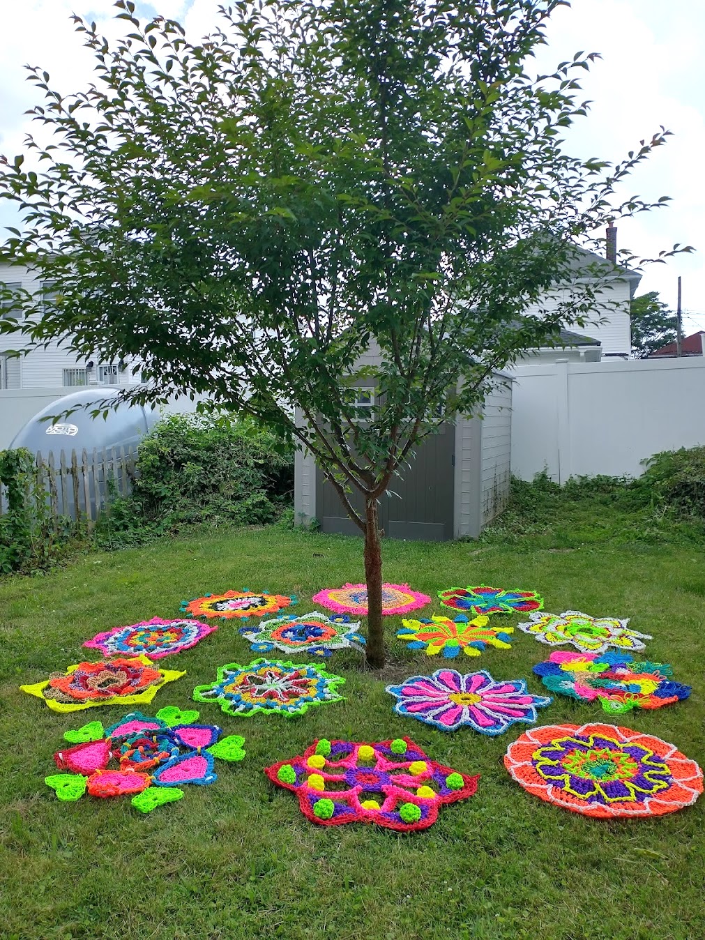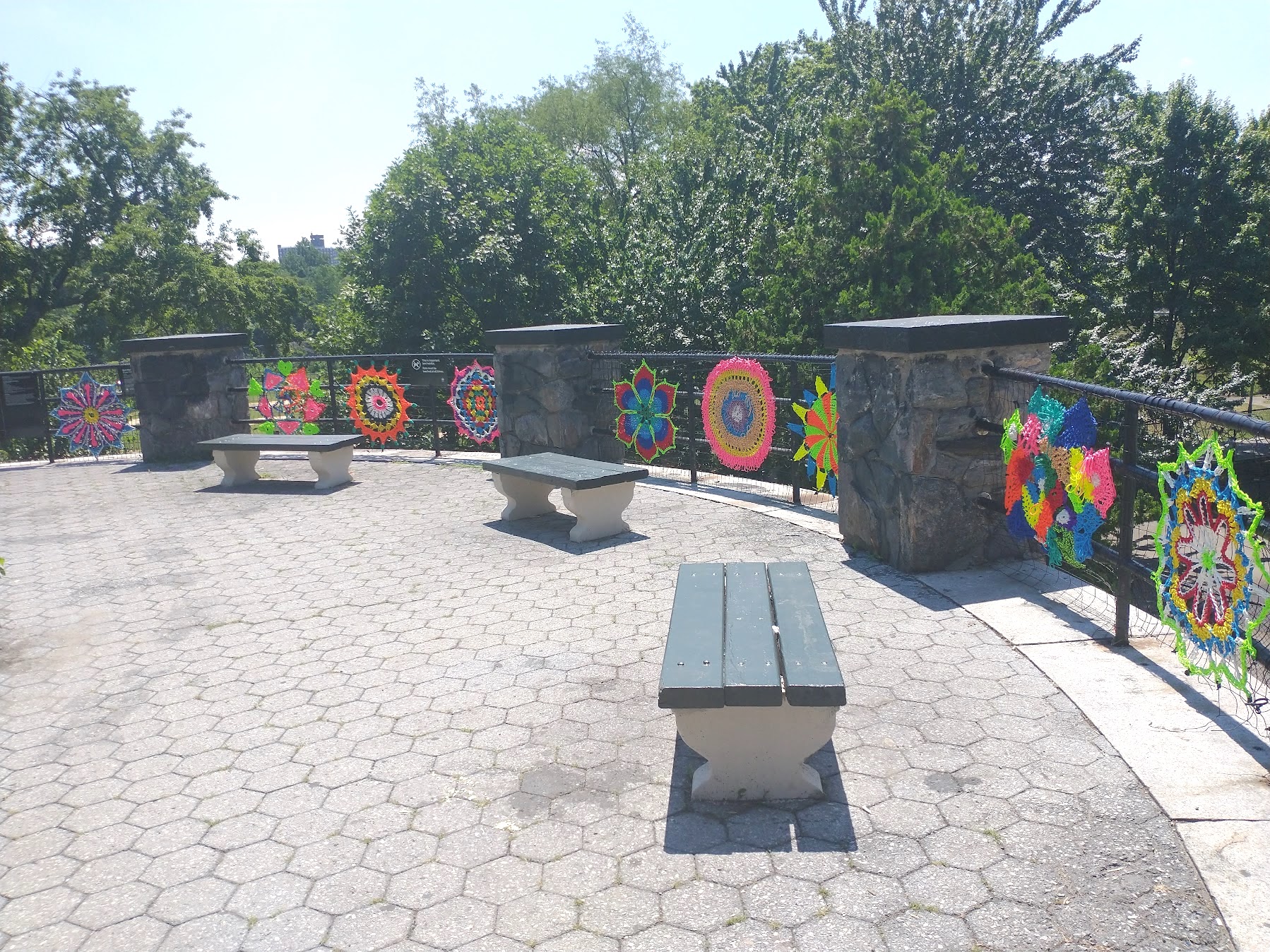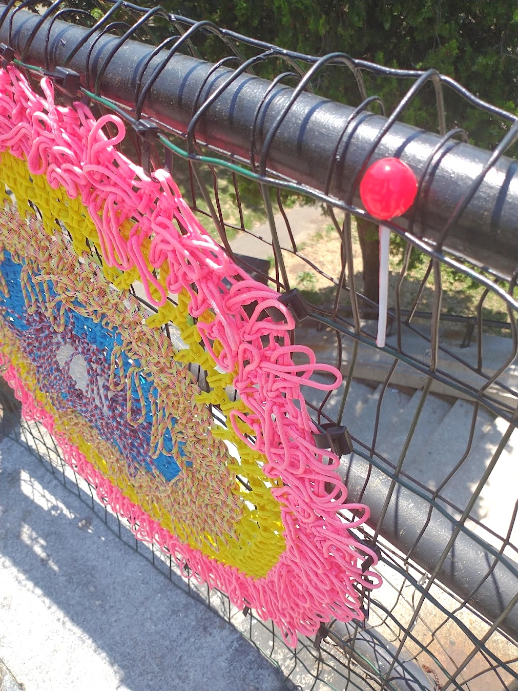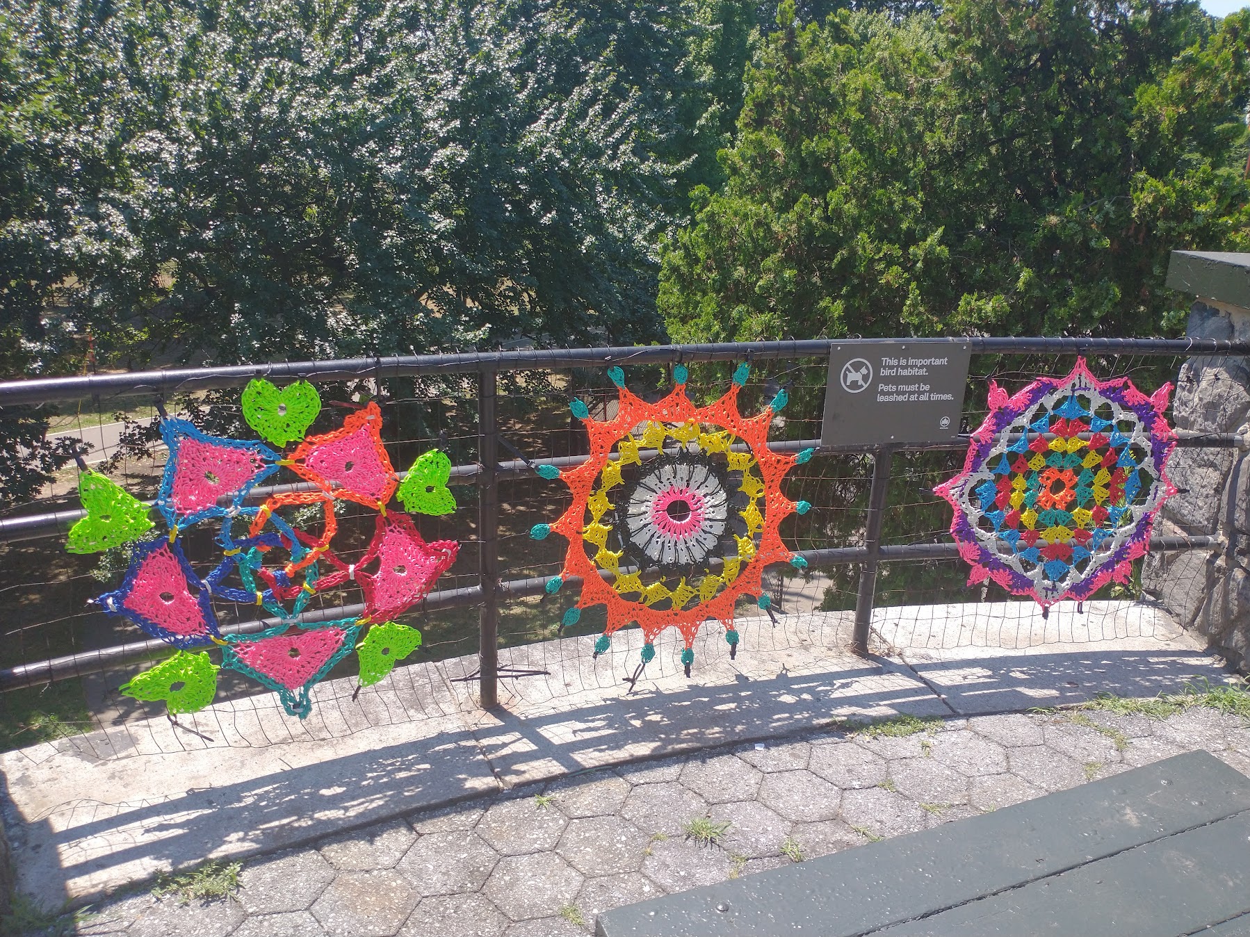 The installation is made up of 14 medallions approximately 32″, (81cm) in diameter, and ziptied onto the fencing at the circular rotunda entrance to the park. I didn’t use any patterns, I just explored ideas and mixed and matched the colors as much as possible. It was a wonderful experience as a creator to just let ideas explode, and I hope I get to expand on these ideas in the future! If you know of any organization that needs an outdoor art installation that is lightweight, flexible in size and easy to install and deinstall, shoot me an email!