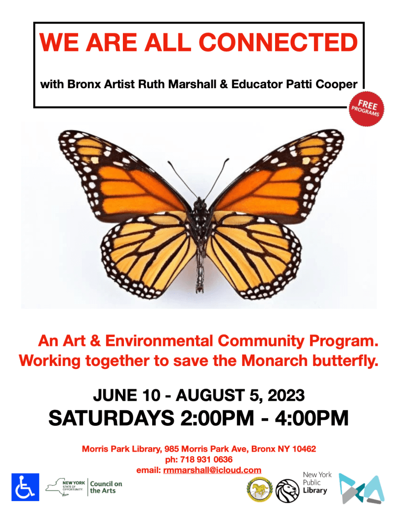 “We Are All Connected” was a 2023 nine week art and education program that engaged the local community to help save the Monarch butterfly. Ruth Marshall, a local Bronx artist, and Patti Cooper, an educator and retired zookeeper from the Wildlife Conservation Society are managing this program with funding via a community arts grant from Bronx Council on the Arts in partnership with the Morris Park branch of the New York Public Library and Morris Park Business Improvement District.