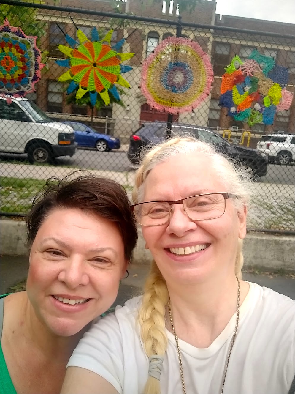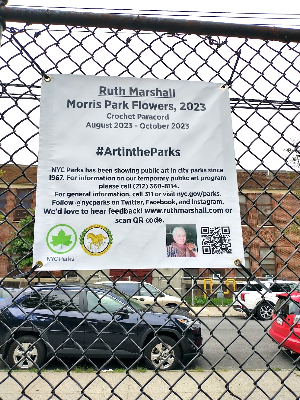 Is now on display at Loreto Playground in the Bronx! Five medallions created with crocheted Paracord, a nylon cord and attached to the fencing with zip ties. Original designs by Artist Ruth Marshall.