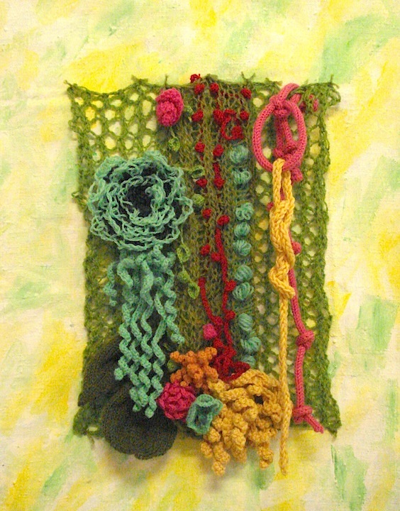 Knit Ditty hand knitting, crochet, canvas, acrylic paint. 2015. 17″ x 22″ (43cm x 56cm) (C) Ruth Marshall Like Loading...