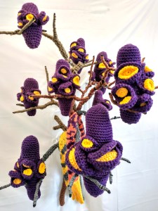 Purple Banksia/Pods 2021 30” x 32” x 18” Hand knit and crochet yarn, cloth, wire, polyfil stuffing. Textile interpretation of Australian Banksia plant.