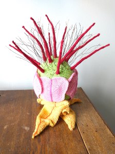 Thistle #1 14”x14”x14” (36cmx36cmx36cm) 2021 Hand knit & crochet yarn wire, poly filler, stone Created during Icelandic Textile Center residency.