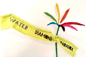 Water Diamond Paradox dimensions variable. 28” x 34” x 13” (69cm x 76cmx 31cm) 2021 Hand knit & crochet yarn fabric, machine embroidery felted wool, wire, aluminium foil. Created during Icelandic Textile Center residency.