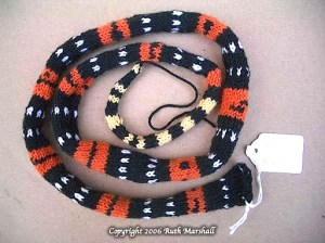 Coral Snake Some snakes from the Coral Snake Series. 2006. Dimensions variable. Hand knit yarn, t-pins, labels. (C)Ruth Marshall. Like Loading...