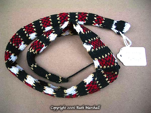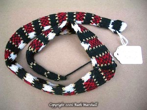 Some snakes from the Coral Snake Series. 2006. Dimensions variable. Hand knit yarn, t-pins, labels. (C)Ruth Marshall.